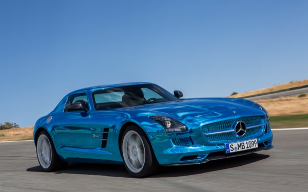 Ecco la Mercedes SLS AMG Electric Drive con ali di gabbiano e cuore elettrico nella particolarissima tinta azzurra cromata.