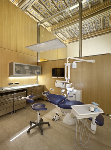 Lo studio si sviluppa su una superficie complessiva di circa 450 metri quadri ed è suddiviso in due zone funzionali: una dedicata allo spazio attesa, amministrazione e studio privato dei medici, l’altra, quella operativa, dove trovano posto sette studi, la sala di sterilizzazione e gli spazi di servizio dedicati al personale. Per tutta la pavimentazione, sono stati utilizzati circa 415 mq di marmo Botticino Classico, un materiale particolarmente resistente e duraturo, caratterizzato da delle rare macchie fiorite e delle venature dorate su uno sfondo color crema.