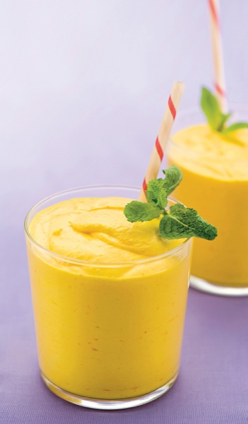 ·2 banane ·1 bustina di zafferano ·6 cubetti di ghiaccio ·2 cucchiai di limone ·½ l. di latte ·foglie di menta per decorare