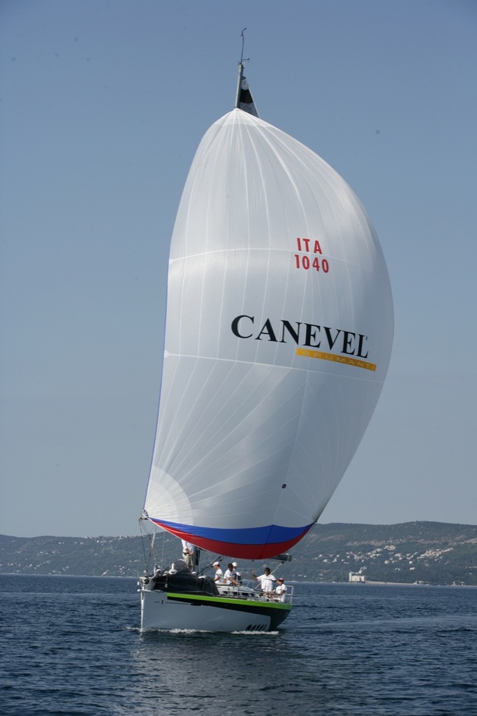Presente nell’equipaggio negli appuntamenti triestini, Carlo Caramel in rappresentanza del main sponsor Canevel Spumanti visibile nelle splendide vele.