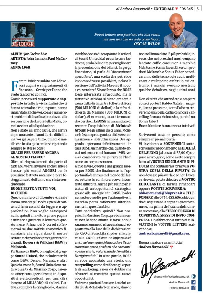 Questo numero di dicembre è, a mio avviso, uno dei più ricchi e pieni di contenuti interessanti da leggere e approfondire. Non voglio anticiparvi nulla, quindi vi invito a girare pagina e iniziare a gustarvi la lettura di questo mese. Prima, però, vorrei soffermarmi su due notizie economico-finanziarie che riguardano il nostro settore e che vedono protagonisti due giganti: Bowers & Wilkins (B&W) e McIntosh.