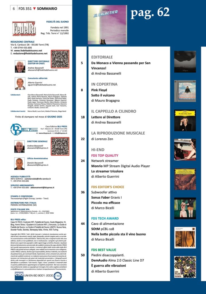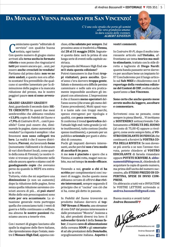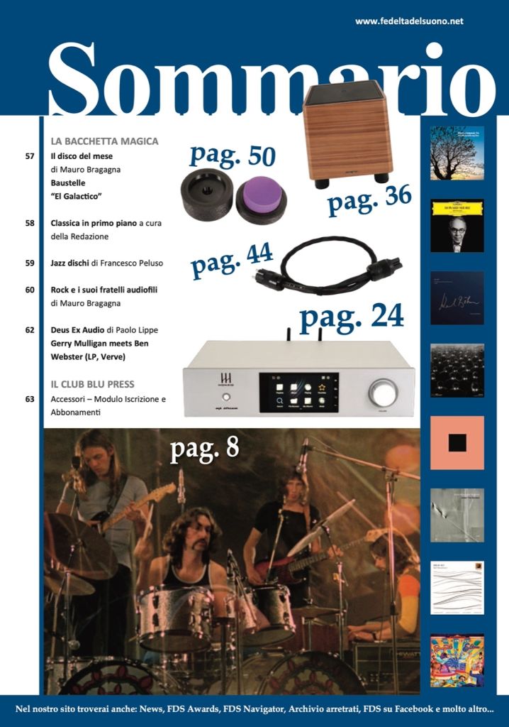 Scrivetemi cosa ne pensate, come sempre in piena libertà… Vi invitiamo a SOSTENERCI sottoscrivendo l’abbonamento a FEDELTÀ DEL SUONO (al costo di 75,00 €) oppure a rivolgervi, come avete sempre fatto, al VOSTRO EDICOLANTE DI FIDUCIA che continuerà a fornirvi la VOSTRA COPIA DELLA RIVISTA! Se non dovesse più averla o se non l’avesse ricevuta, potete chiedere al VOSTRO EDICOLANTE di farsela rimandare oppure POTETE SCRIVERE A: abbonamenti@blupress.it, chiedendo di acquistare la copia di questo numero, ma prima dell’uscita del numero successivo, allo STESSO PREZZO DI COPERTINA, SPESE DI INVIO COMPRESE.