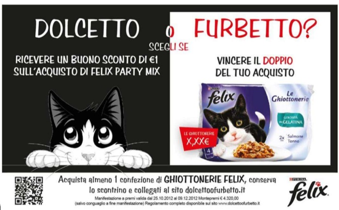 Fino al 9 dicembre 2012 visitando il sito www.dolcettoofurbetto.it, tutti i proprietari degli amici a quattro zampe potranno divertirsi scegliendo tra due possibilità: “dolcetto” , per ricevere un buono sconto di 1€ sull’acquisto degli snack della nuova gamma FELIX Party Mix, o “furbetto”, per tentare di raddoppiare l’acquisto fatto. Chiunque acquisterà almeno una confezione de Le Ghiottonerie FELIX, i teneri pezzettini di carne e pesce avvolti in deliziosa gelatina, potrà inserire i dati dello scontrino sul sito dedicato all’iniziativa e tentare la fortuna per ricevere direttamente a casa il doppio dell’acquisto effettuato.