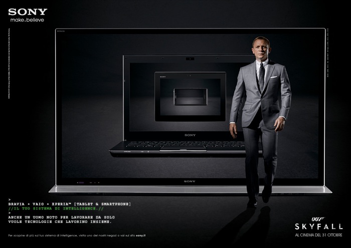 La campagna integrata ‘IL TUO SISTEMA DI INTELLIGENCE’ vede come protagonisti alcuni tra i più innovativi prodotti a marchio Sony: in prima fila, Xperia Tablet S e lo smartphone Xperia T, i laptop VAIO e i TV BRAVIA, presentati in avvincenti messaggi promozionali creativi, online e non. Questi prodotti sono effettivamente presenti anche in alcune scene di SKYFALL.