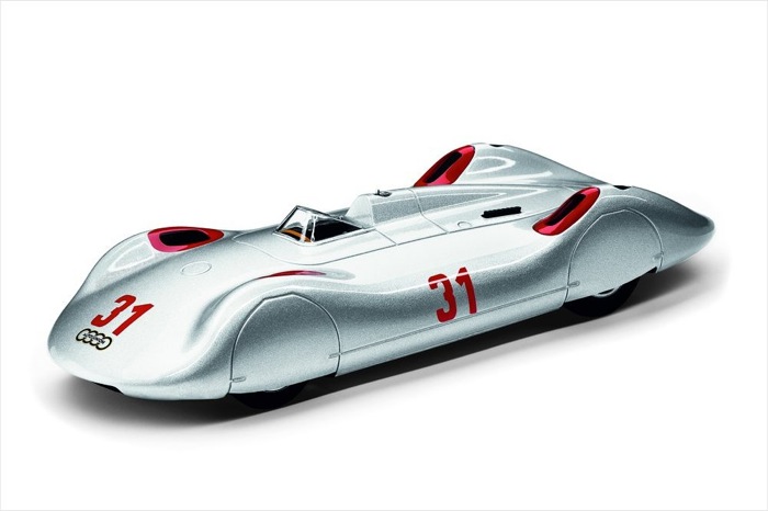 La storia e l’avanguardia tecnologica. Per ricordare i grandi successi dell’automobilismo sportivo, è possibile scegliere, in scala ridotta, tutta la gamma Audi, i vincitori delle gare del passato e i modelli della tradizione. Oltre dal modellino della storica Audi Sport quattro del Rally di Montecarlo del 1985, la tradizione sportiva della Marca è ben rappresentata dall’eleganza speciale e senza tempo delle vetture da corsa dell’Auto Union Gran Prix degli anni ’30 e Avus Stromlinie del ’37, che, con la forma futuristica della sua carrozzeria, è tuttora un oggetto di grande fascino. Tutte queste miniature sono disponibili in scala 1:43.