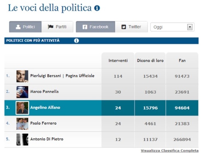 Una tabella renderà invece conto dei Politici con più attività con le informazioni relative alle Fan Page di Facebook o agli account di Twitter monitorati. Per ogni Fan Page di Facebook verranno proposti il numero delle attività, il dato relativo al “Dicono di loro” (“People Talking About”), misurato come varianza nell’intervallo di tempo selezionato, e il numero di fan così come rilevato all’orario di aggiornamento. Per ogni account di Twitter vengono invece mostrati il numero di attività, il numero di following e di follower dell’account, così come rilevato all’orario di aggiornamento.