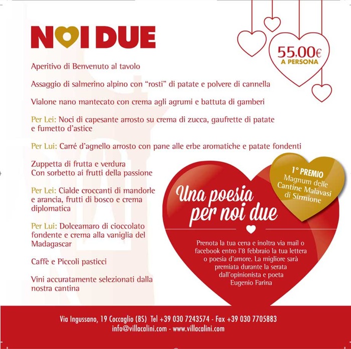 Una splendida villa immersa nella campagna franciacortina, una sala romantica e un menù “per due”, con portate diverse per lei e per lui: questa è l’idea di Alessandro Cappotto, chef-patron di Villa Calini, per un San Valentino a misura di gourmet. Così, dopo un assaggio di salmerino alpino e il Vialone Nano mantecato con crema agli agrumi e battuta di gamberi, le signore potranno proseguire con le noci di capesante arrosto su crema di zucca, gaufrette di patate e fumetto d’astice, mentre per i signori ci sarà il carrè d’agnello arrosto con pane alle erbe aromatiche. Si chiude in dolcezza, con le “femminili” cialde croccanti di mandorle e arancia, servite con frutti di bosco e crema diplomatica, e il “maschile” dolceamaro di cioccolato fondente, accompagnato da una crema alla vaniglia del Madagascar. Un divertissement culinario che rivela il desiderio dello chef di proporre sempre piatti armoniosi, bilanciati, preparati con ingredienti di stagione, ma al contempo sorprendenti e innovativi (menù a 55 euro a persona). Per chi invece è alle prese con l’organizzazione del matrimonio, dal 14 al 17 febbraio Villa Calini organizza il Wedding Preview: ovvero un’anteprima del menù nuziale, dagli antipasti ai dessert, proposto per l’occasione a 40 euro a persona. Info: www.villacalini.it