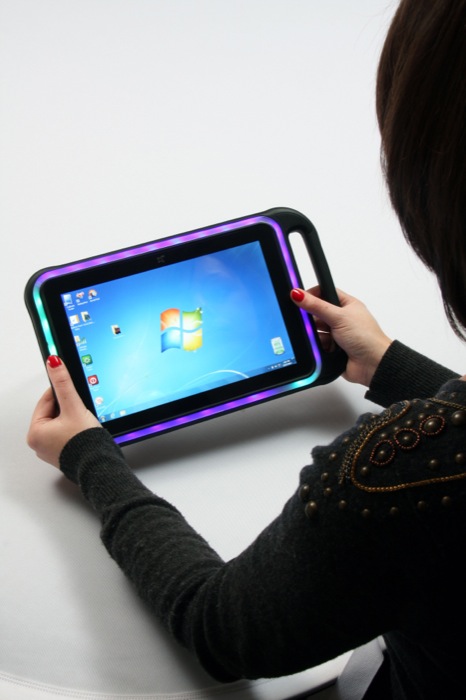 The rugged gaming tablet has a built-in handle and kick stand and includes a large lithium polymer battery that allows up to 12 hours use between charges. A fast charge mode can be used to cope with multi-session gaming periods reducing the time required for charging the devices.