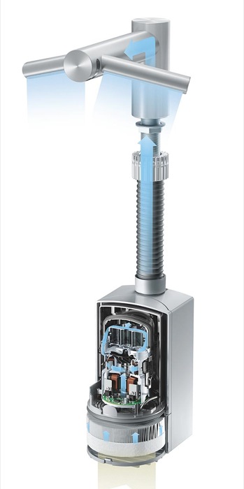 Progettazione del vano motore: i componenti principali, incluso il motore, sono situati in un vano posizionato sotto il lavandino. Gli ingegneri Dyson hanno impiegato oltre 2.240 ore per progettare il posizionamento del motore e hanno lavorato duramente per ridurne il rumore – introducendo: molle per diminuire le vibrazioni, isolanti acustici per assorbire il rumore e una camera d’espansione per migliorare la qualità del suono.